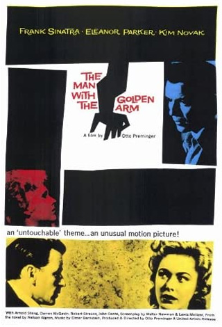 THE MAN WITH THE GOLDEN ARM (1955): A recovering heroin addict (Frank Sinatra) struggles to stay clean when returning to Chicago’s South side, to old friends and old temptations, after a prison stint. His drug dealer Nifty Louie (Darren McGavin) wants to get his hooks back into Frankie, but his love for Molly (Kim Novak) and his dreams of becoming a jazz drummer keep him on the straight and narrow. When Louie is killed, the cops figure him for the murder and come after him. Dir. Otto Preminger