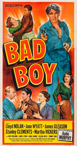 BAD BOY (1949): Marshal Brown (Lloyd Nolan), superintendent of the Variety Club's Boys' Ranch and his wife (Jane Wyatt) attempt to reform newcomer Danny Lester (Audie Murphy). The film was produced in association with Variety Clubs who took a more progressive approach to teenage criminals than the prison system. This was Audie Murphy’s third film and his first lead. The Texan theater owners who helped finance the film insisted on his casting. The most decorated soldier of WWII turned actor would find fame later playing heroic roles in Westerns later including three with Dan Duryea. Murphy gets to show a darker side combined with charisma and eventually vulnerability. He would do it again in two of his Westerns, Anthony Mann’s Night Passage and his best film, the Noir Western No Name on the Bullet. Dir. Kurt Neumann